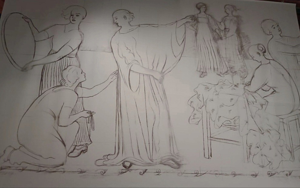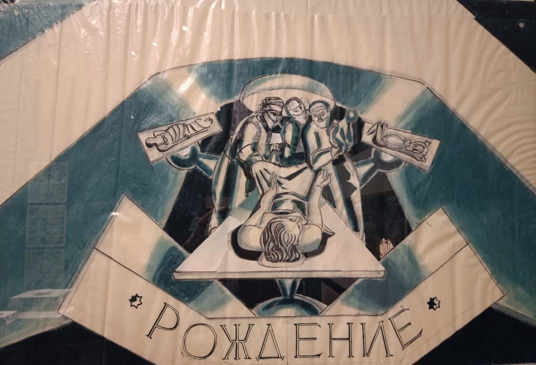 Самая нежная, на мой вкус, часть экспозиции посвящена монументалистским опытам Владимира Фаворского. Посетителям показывают росписи Музея охраны материнства и младенчества (1923), оформление фасада Дома моделей и сграффито (керамическое панно) «Молодость». Фрески удивительно гармоничные. Для рассказа о современности художник использовал прообразы из мирового искусства, его матери и няни наследуют мадоннам, оформление стен цитирует египетские и античные росписи. Художник использует технику лессировки, благодаря чему фрески выглядят легкими, акварельными. Пропагандистское здесь уходит на второй план, на первом ― естественная красота материнства, передача женского опыта, первые шаги ребенка. Автор включает в монументальное высказывание точные и человечные наблюдения, придающие ощущение камерности. И такое художественное решение оправдано: фрески украшают внутреннее пространство Музея, укромный мир материнства, младенчества и раннего детства.