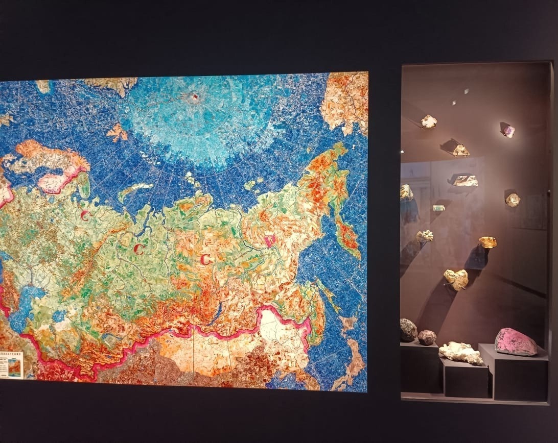 Самая «родная» часть экспозиции посвящена грандиозному каменному панно «Индустрии социализма». Мы с дочкой недавно видели его живьем в институте ВСЕГЕИ (СПб), в тамошнем музее геологии, где директорствует наша подруга Анна Абрамова. Она нам и проводила экскурсию. На выставке в Музее Москвы было не само панно-карта из самоцветов, а его изображение и каменный иллюстративный материал.