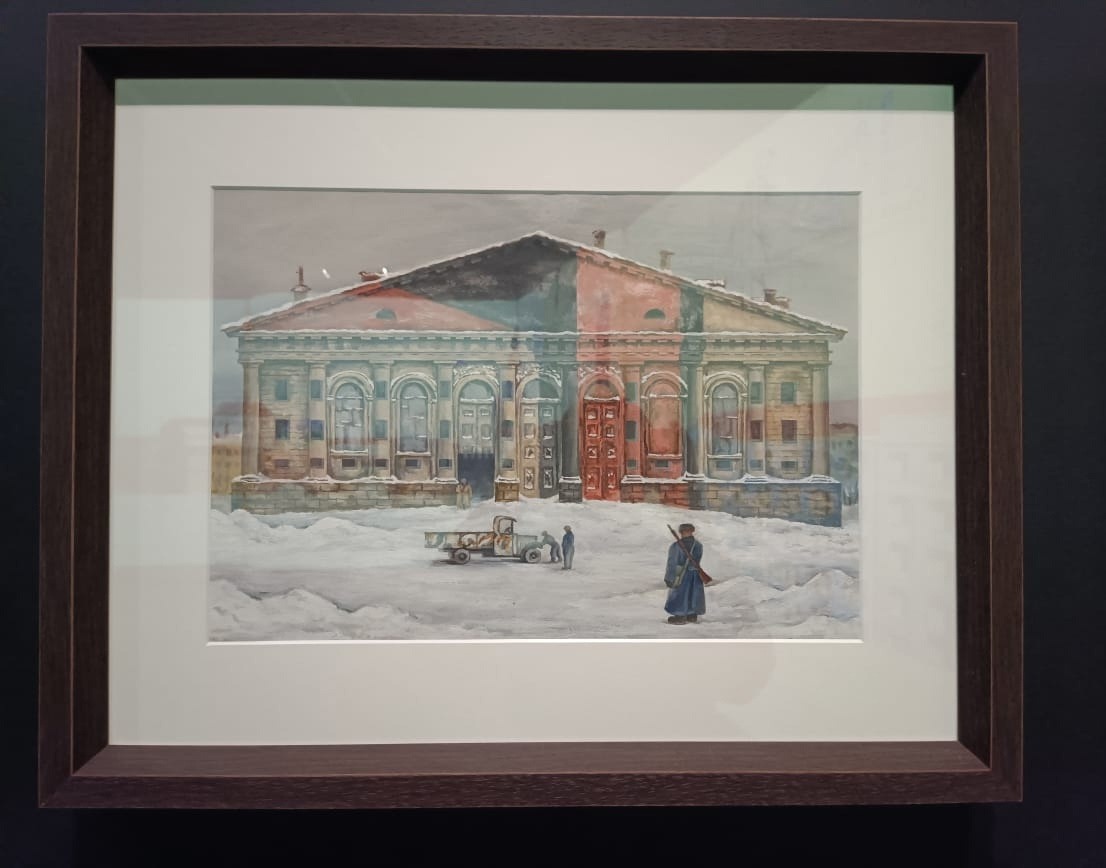 Упомяну и другую выставку. «Казус Мейерхольда» сейчас идет в Театральном музее СПб. Один из трех залов посвящен проекту мейерхольдовского театра — помпезной громадине в стиле 20-х (тогда дело и происходило). Фриз планировалось украсить мозаикой, посвященной немой сцене из «Ревизора». От этих эскизов, ярких и довольно-таки гротескных, мы почему-то не могли оторваться. Видимо, в нашей персональной реальности наступал период монументального искусства, данный нам в отличных выставках.